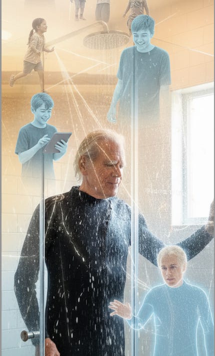 Pre-shower Me thinks about Morning Me and Evening Me and how different they are. He thinks back to Teenaged Nighttime Me who would jerk off before going to sleep almost every night, then ashamed at what he’d done would promise himself that this was the last time. It’s a promise that Teenaged Morning Me would reaffirm. But later, next bedtime, Teenaged Nighttime Me would repeat the ritual—complete with release, relief, and regret. Teenaged Me learned that this was normal behavior for human males of his age without sex partners. But it didn’t matter. The shame was there, renewed nightly. (Thank you Teenaged Me’s, for getting me here. Let go of whatever shame you may still bear.)