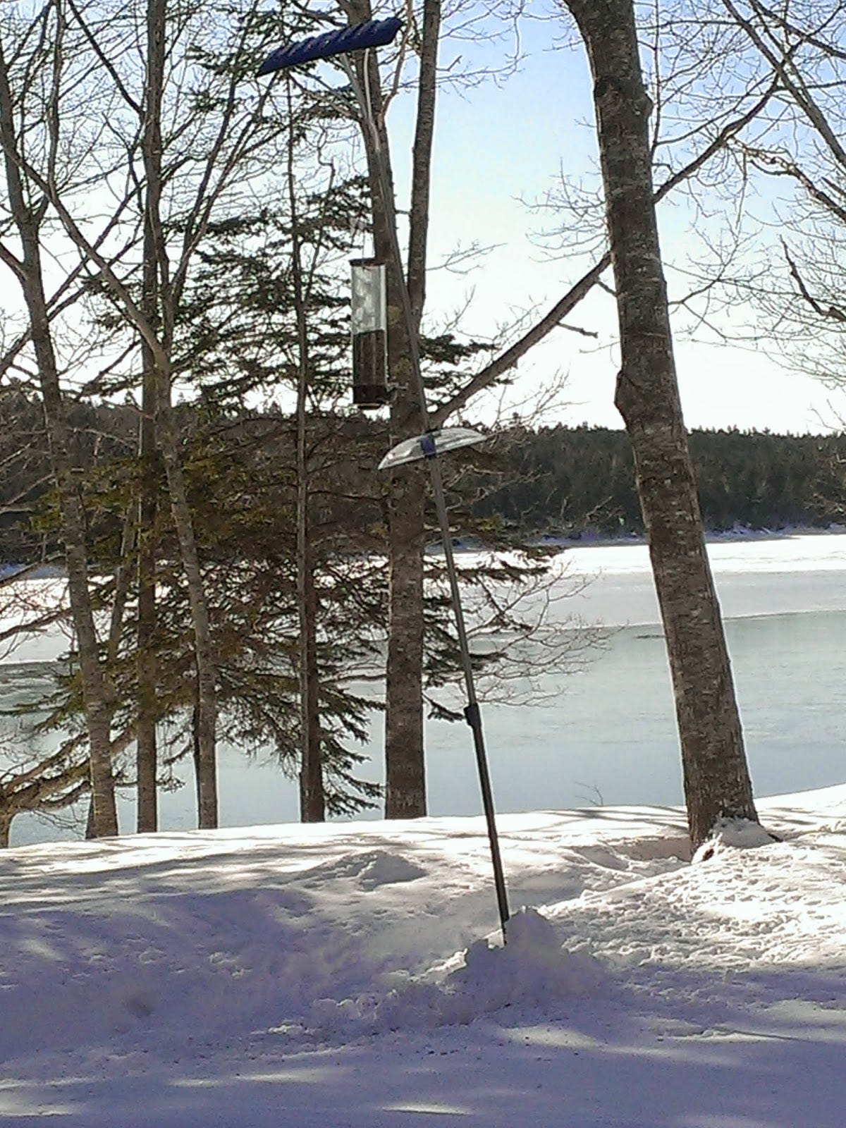 But man is not to be overcome by squirrel. At least this particular man is not to be overcome by those particular squirrels. I repurposed the roof-rake that I bought to clear our porch skylight and other roof surfaces as a temporary feeder holder. It sits in the yard, stuck in the deep snow. The plastic shield that eventually replaced the upside-down bowl and which used to be on top of the feeder has been moved so that it prevents assault from below.