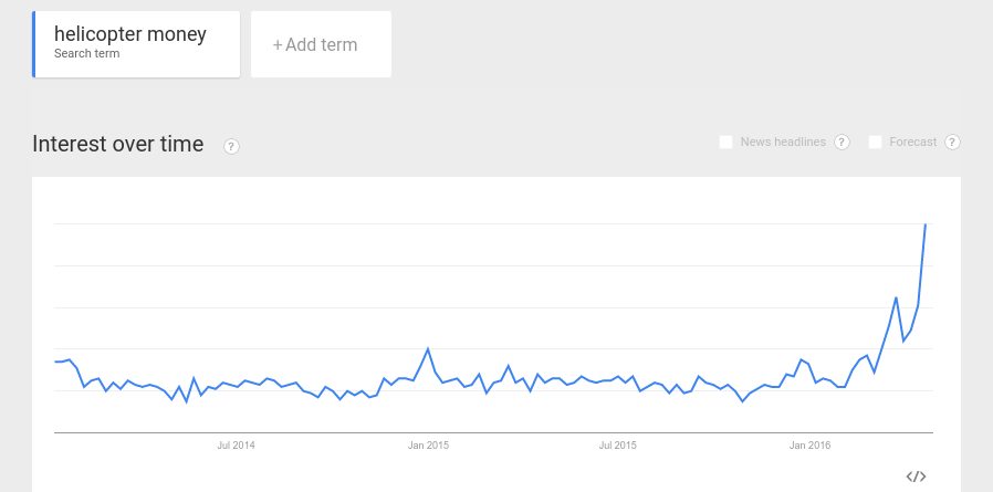 Bernanke has recently published an article at Brookings on the subject. "What Tools Does the Fed Have Left? Part III Helicopter Money." and that seems to have prompted the latest spike in in interest in "helicopter money" as shown here in Google Trends.